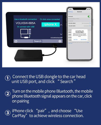 Inserting our product to the car USB port and connect the Bluetooth and WIFI of the iphone enjoying the wireless apple can play on the road.