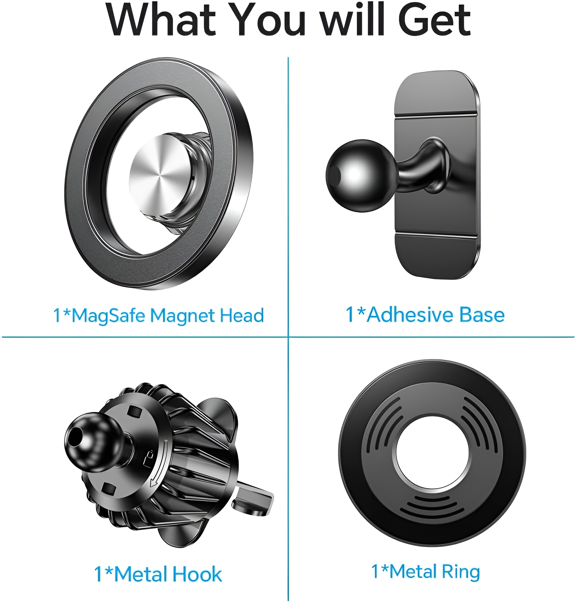 - Included in the Box: 1 Magnetic Head, 1 Adhesive Base, 1 Metal Hook, 1 Metal Ring