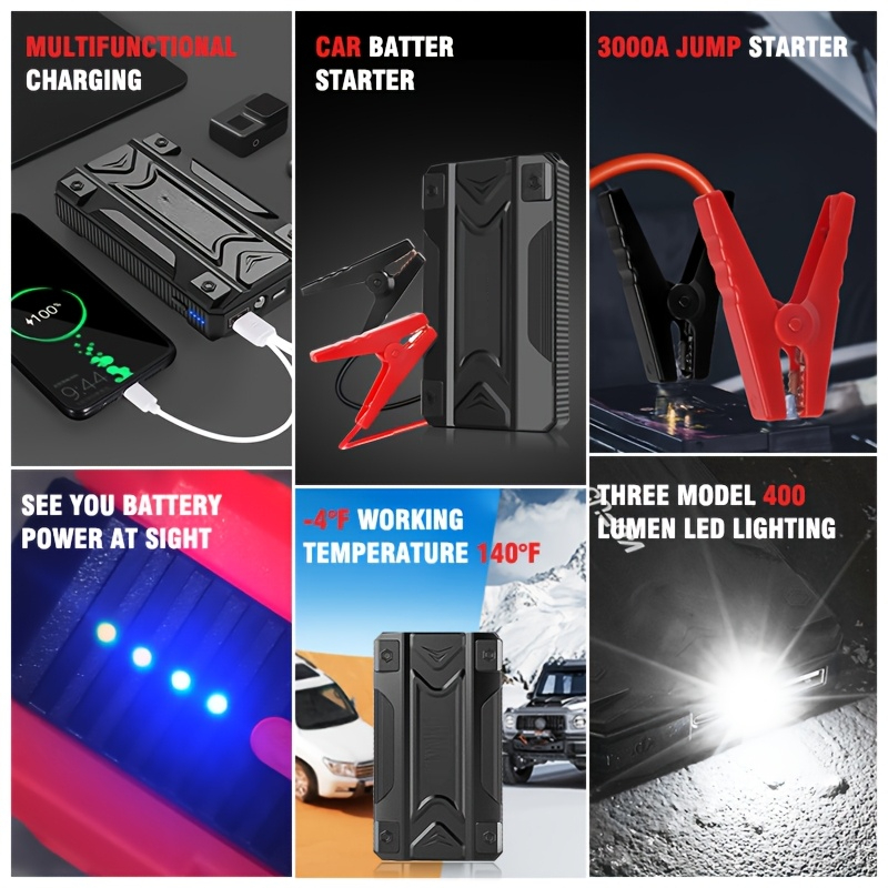 This compact device combines jump-starting capability, USB charging, and emergency lighting in a single unit. The rechargeable lithium battery allows repeated use, while the portable design ensures the device can remain stored in a vehicle for emergencies.