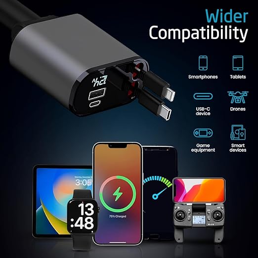 3-in-1 Design: Features a retractable cable with Lightning, Micro USB, and Type-C connectors, making it compatible with various smartphones, tablets, and other gadgets.